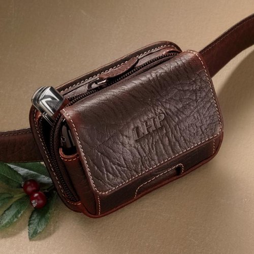 Genuine bison two-bay holster for iPhone, BlackBerry, small digital camera, or any device less than 1" thick and 4" wide. Loops onto belt and front pouch has a magnetic easy-access flap to get to the device quickly without fumbling with snaps or zippers. Rear compartment zips closed for other small items. In brown. Bison leather. Imported. Dimensions: 5"L x 3 1/2 "W x 2"D.